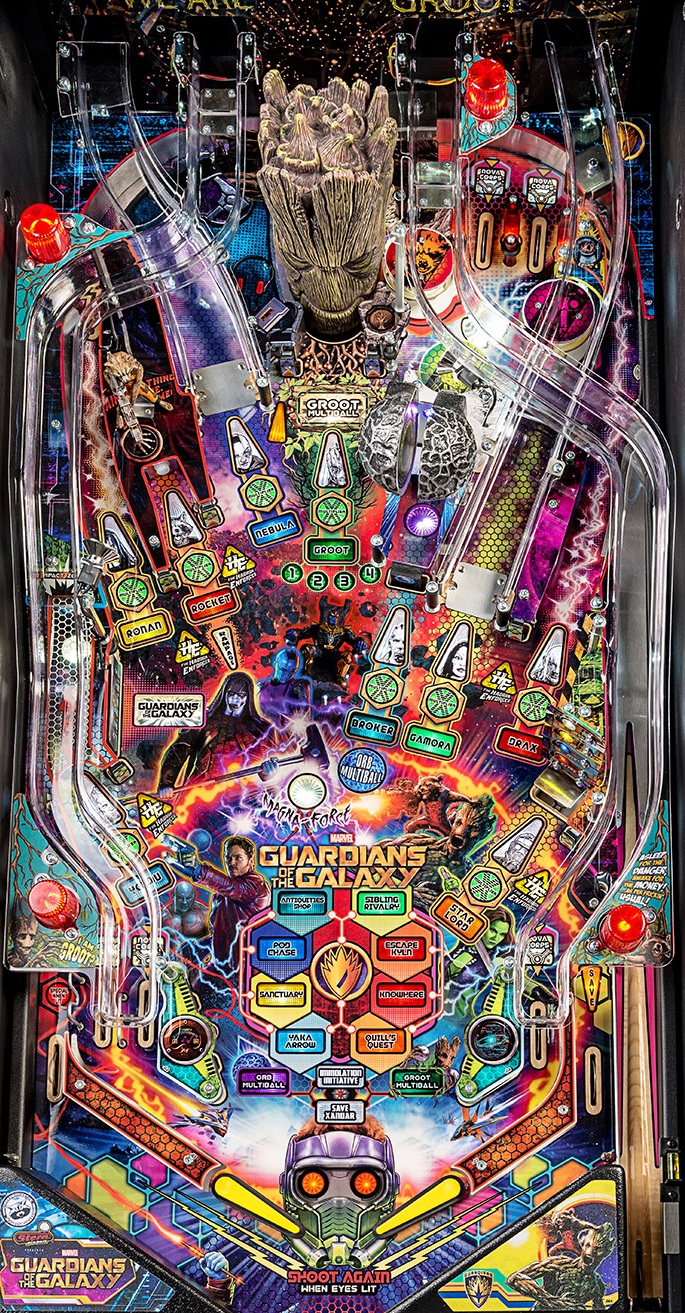 Hit 8 white shots to complete the mode. Shooting into the pop bumpers (orbits divert) lights a new shot and spots mode advancement. In order, the temporary shots are Groot (at start), left orbit, left ramp, right orbit, right ramp (?), (?). Shots start at 1,000,000 and increases by 500,000 each shot.